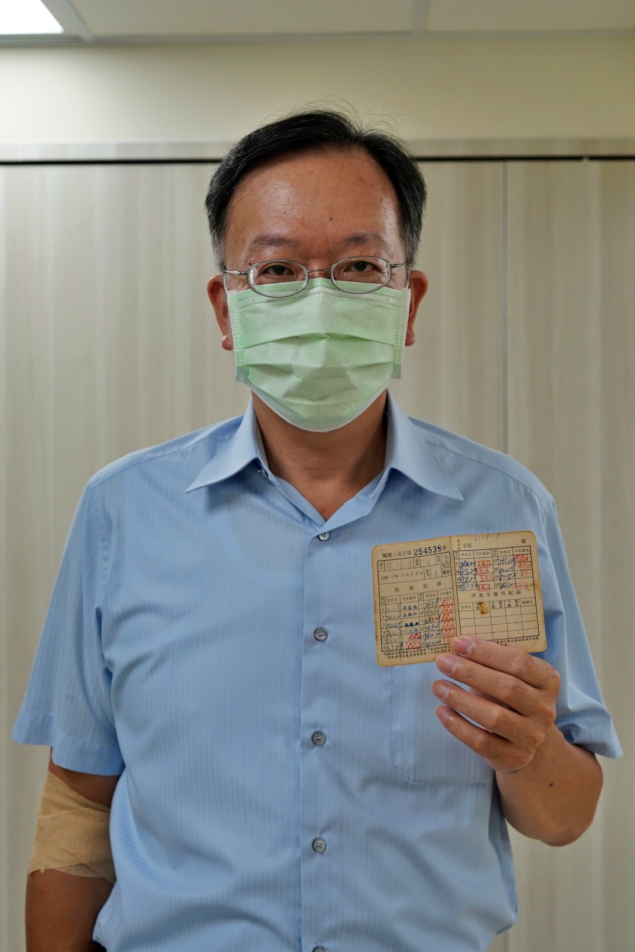 說到此,楊俊彥從皮夾掏出一張紅色的捐血紀錄卡,翻開後紙張已然泛黃陳舊,上頭盡是親筆手寫的捐血紀錄,後頭還有主任核章,見證他第一次捐血的日期。這張紀錄卡的封面本還有燙金「高雄捐血中心」標誌,現在已經褪色得快看不出字樣,足見歷史悠久,但楊俊彥仍保存得很好。