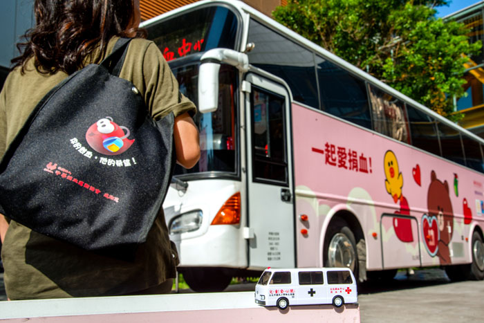 獲得入選的作品「大家一起愛血」,背著捐血人專屬的環保袋,走向LINE的主題捐血車,提醒著「你的熱血,他的希望,大家一起愛捐血!」