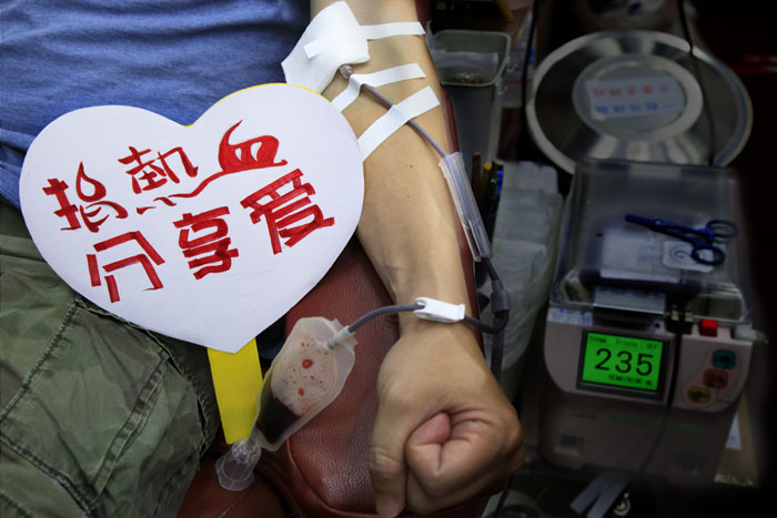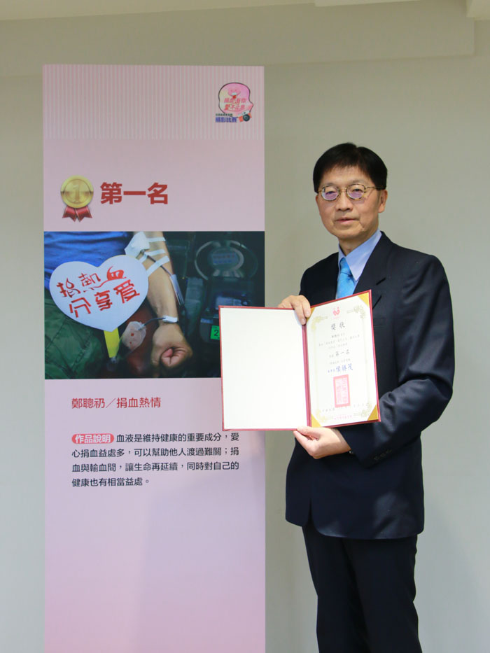 鄭聰礽獲得首獎作品「捐血熱情」,照片表達的是「血液是維持健康的重要成分,愛心捐血益處多,可以幫助他人渡過難關,捐血與輸血間,讓生命再延續,同時對自己的健康也有相當益處。」