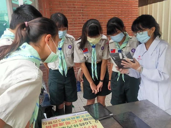 110年3月1日淵明國中童軍團協助林內巡迴捐血活動,認真跟護理同仁學習如何協助捐血民眾填寫電子登記表。
