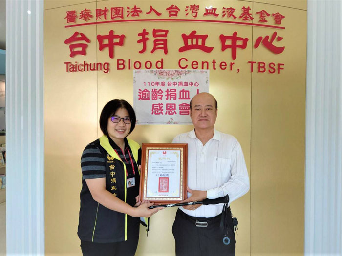 台中捐血中心舉辦逾齡捐血人感恩會,企劃課課長陳家綺代表頒贈獎狀予陳居旺先生。