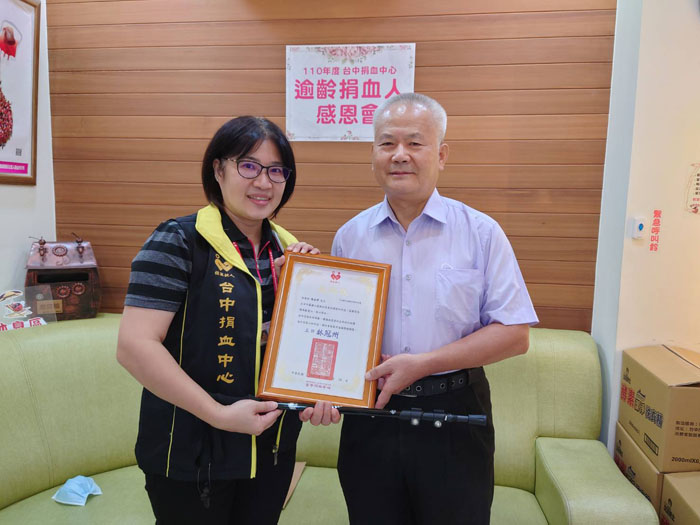台中捐血中心舉辦逾齡捐血人感恩會,企劃課課長陳家綺代表致贈獎狀予資深捐血人陳金澤,在豐原捐血室合影。