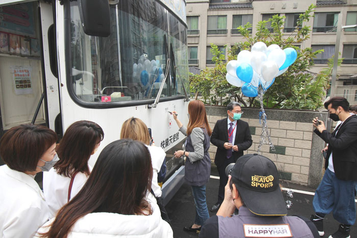 來自台北及台中的快樂集團夥伴們來到台中捐血中心歡送「快樂天使2號」。