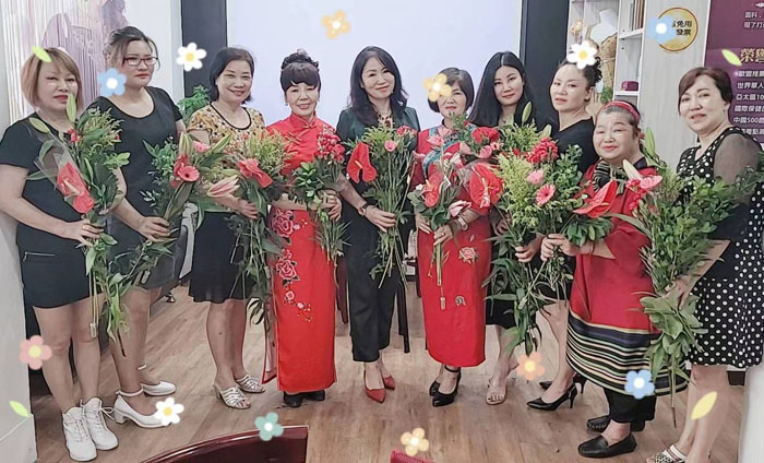 謝洪麗珠老師(右二)受邀參加母親節活動,教授花藝。(照片提供/謝洪麗珠)