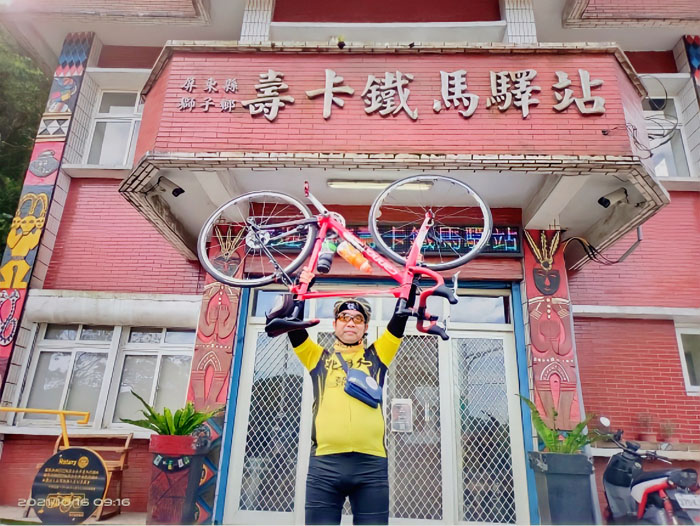 熱愛騎單車的甘治祥,110年參加台北科大EMBA鐵馬社48小時接力環島活動,擔任第五棒,在壽卡鐵馬驛站留念。(甘治祥提供)