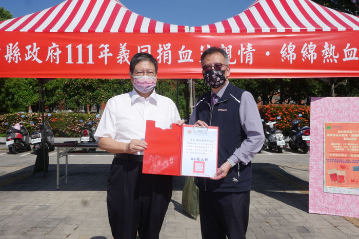 新竹捐血中心主任王雲龍(右),頒贈感謝狀予新竹縣長楊文科(左)感謝新竹縣政府大力支持捐血公益。
