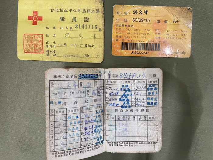 約訪這天,一到捐血室,洪文峯便拿出他民國71年第一次捐血的捐血卡,以及絕版古董級的緊急捐血隊員證和榮譽卡。這些對他來說非常有紀念意義,猶如傳家寶,所以他跟退伍令放在一起,隨時都找的到!