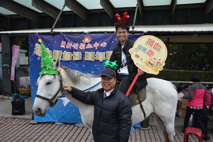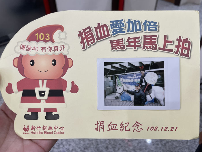 還記得那年是馬年,在網路上看到有捐血月活動「馬年馬上拍」,新竹捐血中心真的拉了一匹馬到東門城捐血亭,讓完成捐血的朋友,可以坐上馬背拍照,並且馬上將拍照沖洗出來帶回家,覺得很有趣。於是邀約兒子一起去捐血。當時想說以後可以給孫子看,跟孫子說阿公和爸爸曾一起去捐血喔!時光飛逝,一轉眼已經是9年前的事情了。好在當時有約兒子一起參加,現在想起來還是覺得很有趣。