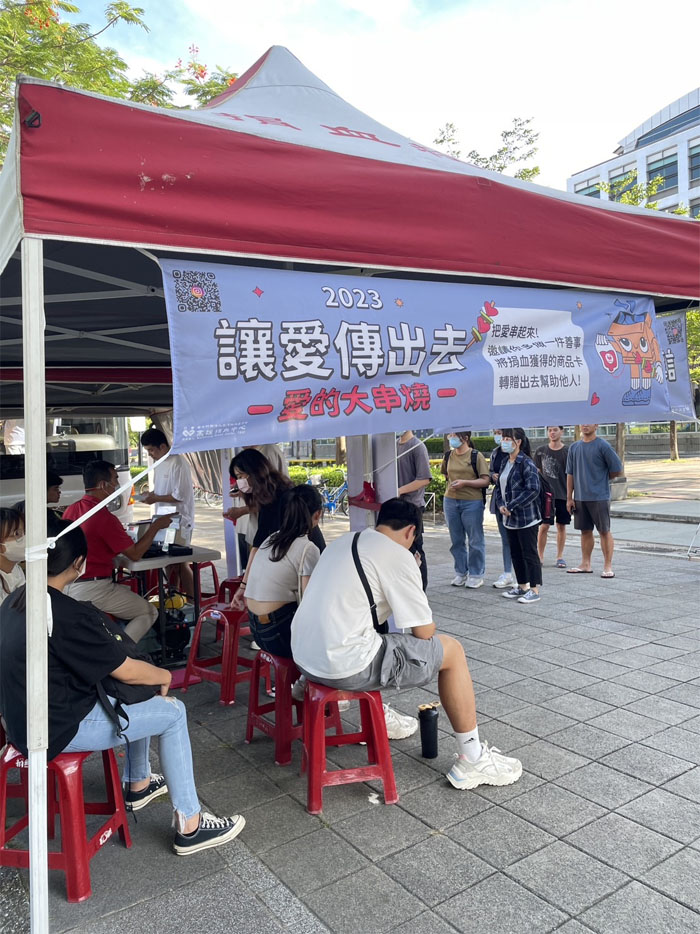 儘管溽暑難耐,同學的熱情也從未被熱浪拍散,耐心在現場等候,只為捐獻熱血做公益;不只是有衛保組老師與學生努力推動,滿滿的愛心也打動了學生餐廳裡的店家,第一校區學餐的「菇蒂早安吧」率先加入熱血應援行列—只要同學捐完血來店出示學生證,秀出手臂上的「愛心勳章(彈性繃帶)」就可以兌換一杯鮮奶紅茶!」共同響應捐血活動。