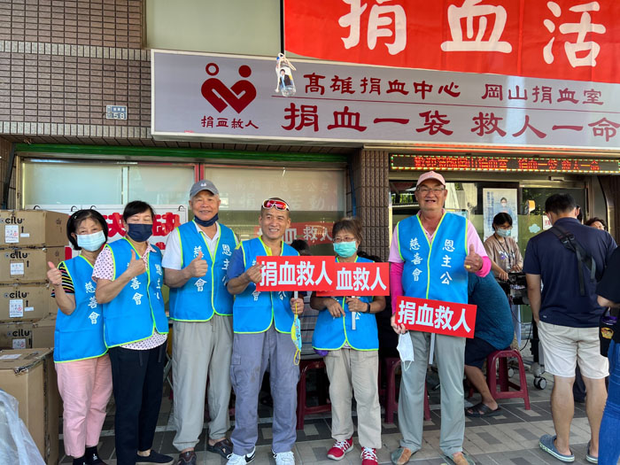高雄市恩主公慈善會理事長陳明河(左3)與高雄市鳳林觀音慈愛會理事高振華(右1)在捐血現場呼籲捐血。