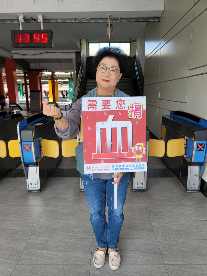 「歡迎大家來捐血,捐血一袋,救人一命,我們等待您的加入!」若你在平常日的週一至週五經過彰化火車站,或許會看到一位頂著花媽頭捲髮、嗓音甜美嘹亮且字正腔圓的婦女,一面高舉「需要您捐血」的牌子,一面熱情地招攬剛走出月台的遊子或遊客們。