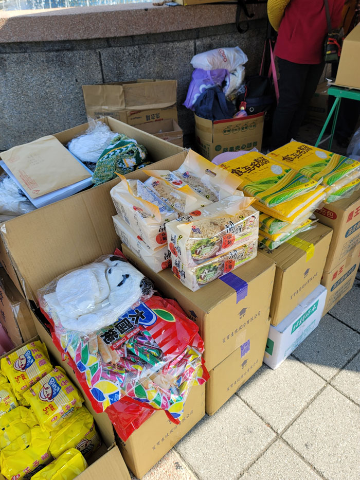 仔細一看,現場有米有麵,有各式點心、零嘴、礦泉水,還有圍巾、毛帽、襪子、耳罩及各式清潔用品……真的非常像個雜貨鋪。朱麗春指著角落的洗衣精說,這是她經過大賣場發現特價時買的、那邊的米和麵是認同她的理念的朋友捐的、這個襪子是她自己的工廠做的、那一袋白醋也是朋友贊助的。