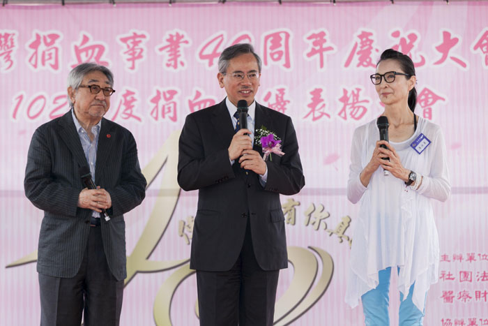 台灣捐血事業40週年慶祝大會,時任衛生福利部長邱文達(中)感謝捐血終身志工孫越及陳淑麗。