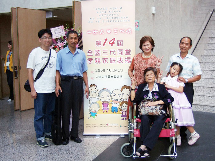 四代同堂12人住在一起,感情依舊融洽緊密,在現代社會實屬難得。圖為民國97年,藍高玉雲一家四代開心參加「全國三代同堂孝親家庭」表揚。