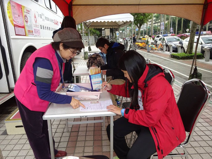 捐血中心缺血宣傳活動,藍高玉雲(左)也到捐血車服務捐血人。