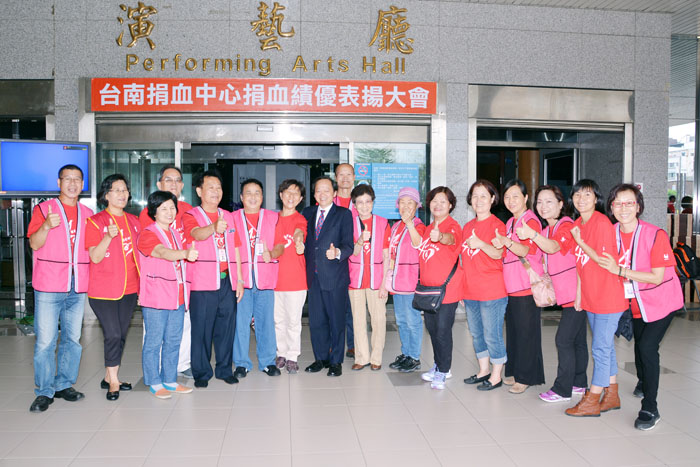 民國103年捐血績優表揚大會,陳秀慧(右4)及志工們與時任理事長葉金川(中)合照。