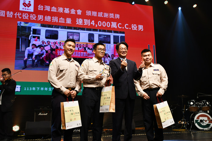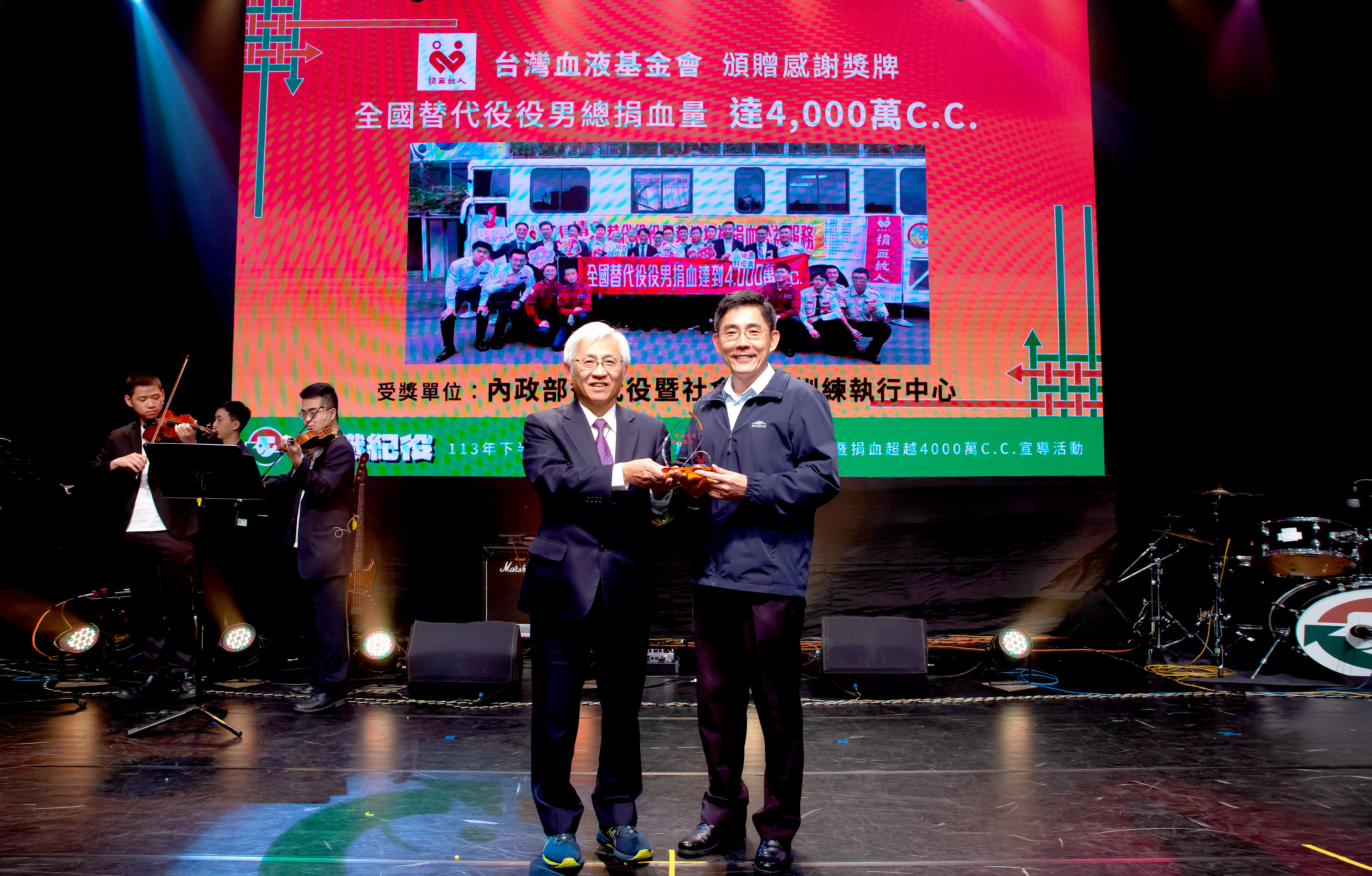 台灣血液基金會受邀至表揚大會,由執行長魏昇堂致贈感謝牌予內政部內政部替代役暨社會韌性訓練執行中心,由執行中心科長李承明代表受獎,感謝其多年來持續推動捐血,並賀達到4000萬cc里程碑。