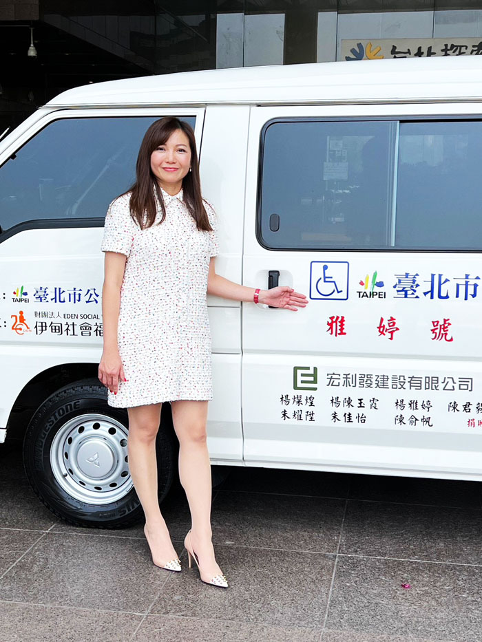 楊雅婷具牡羊座使命必達的特質,快樂自在地悠遊於公益中。圖為宏利發建設於112年4月12日捐贈台北市身心障礙者復康小巴「雅婷號」,讓企業社會責任落實在這個城市。