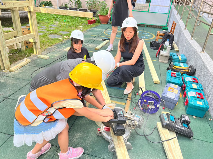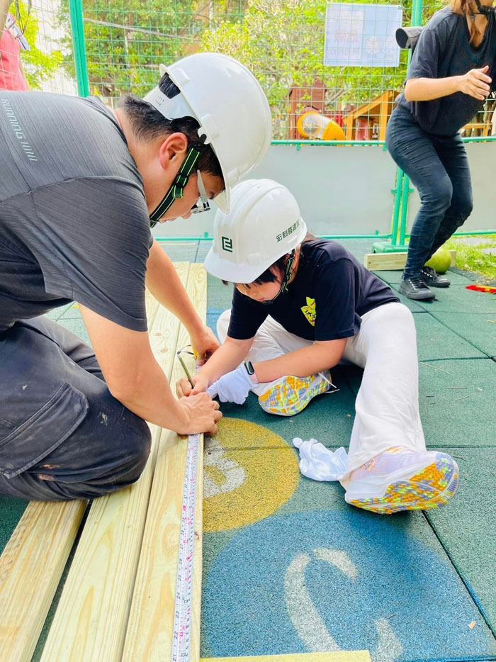 與實境工地現場一樣,小朋友戴上安全帽、手套,在工作人員的陪同指導下,拿起鐵鎚和釘子敲敲打打,臉上充滿成就感,有小朋友害怕鋸子聲音,不敢行動,同仁不厭其煩地鼓勵她勇於嘗試,帶著她拿起踞子成功踞下木板,克服了恐懼,然後也看見這孩子的轉變,從此不再害怕機具,反而當起小老師教起其他小朋友;孩子們願意自己付出行動和學習,親手參與搭建樹屋,舉辦這個活動的收穫非凡。