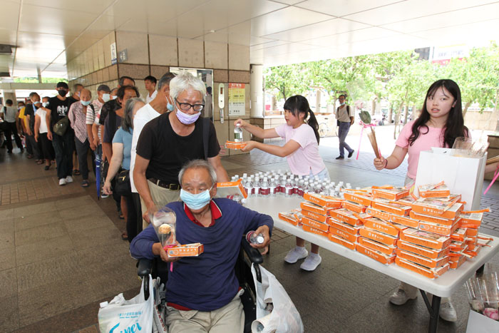 倆姐妹認真發送愛心便當,姐姐帶著親手做的花束遞上溫暖和祝福。