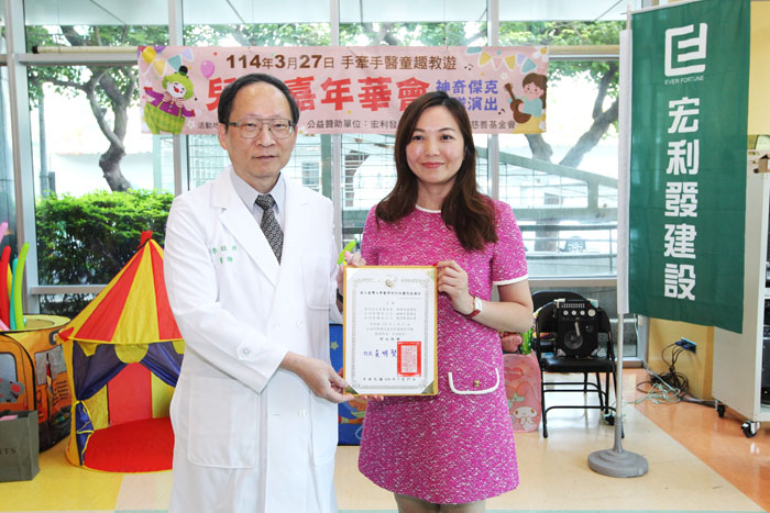 長期關懷病童。4月兒童節赴台大兒童醫院,邀請魔術師及小丑到醫院表演帶給病童歡樂,台大兒童醫院院長李旺祚特到場頒贈感謝狀。