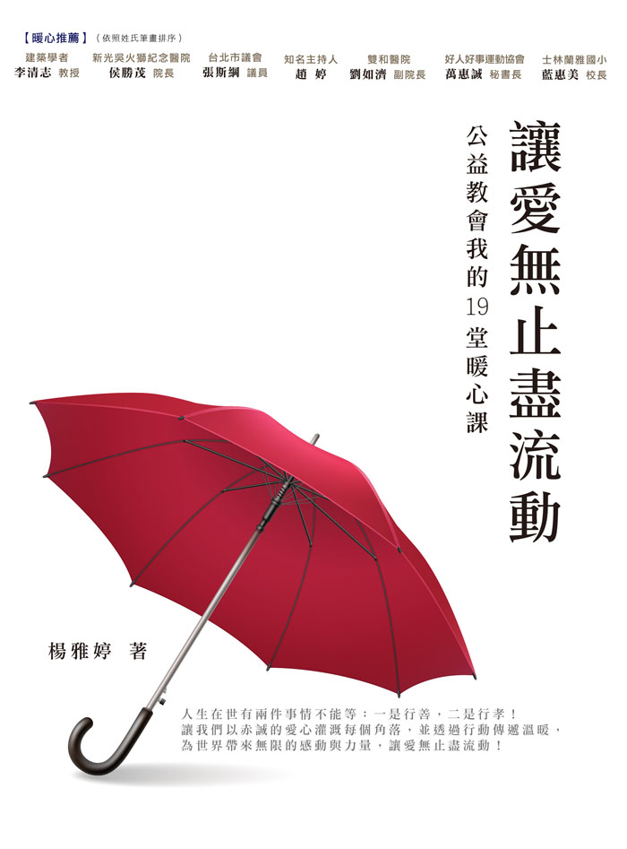 楊雅婷的公益哲學,分享在新書《讓愛無止盡流動 公益教會我的19堂暖心課》中,每一件親力親為的公益行動,透過書中的文字,都能傳達溫暖的感動以及更多對於教育、社會和人們的關注與關懷。