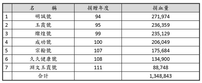 所以,捐血救人始終不能怠慢,一直是父親最重視的,從民國94年開始至今,身為長子的父親率楊氏家族陸續捐贈7台捐血車予台灣血液基金會運用,共耗資4,700萬元打造,為史上來自同一家族捐贈車輛次數最多的記錄,其中較早捐贈的前面4台在使用10年後分別於104年4月至111年3月間功成身退,總計募得100萬袋以上,第7台捐血車也在第4台退役前夕遞補上,以祖父母的名字命名「淵文玉霞」號,感念上一代的樸實良善造就積善人家,樹立行善門風,代代相傳。
