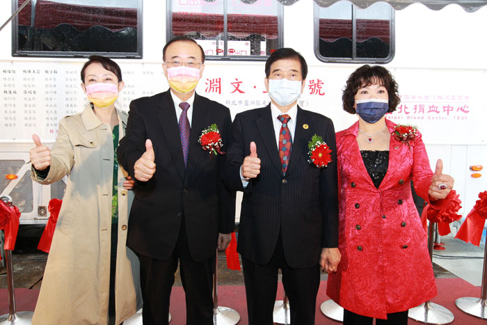 111年淵文玉霞號的捐贈儀式,楊雅婷的父親楊燦煌(右2)以及母親楊陳玉霞(右1)與台灣血液基金會董事長侯勝茂(左2)及董事長夫人劉秀雯(左1)合影。
