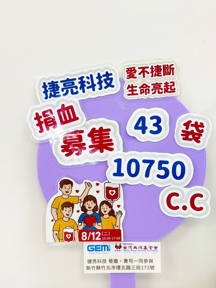 今(114)年8月12日,是捷亮科技股份有限公司創立第16年舉辦的第三屆捐血活動。秉持「愛不捷斷.生命亮起」的初心,活動全程由公司團隊親自策劃,發揮行動力、感染力與創造力。我們自製捐血海報與電子郵件宣傳,並親自走訪鄰里,希望藉此鼓勵更多人來捐血,並且透過捷亮臉書專頁持續傳遞這股愛的力量。