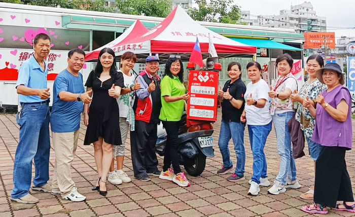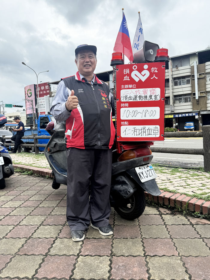 陳水波先生騎小蜜蜂廣播車沿街宣傳,邀約民眾參與捐血活動。