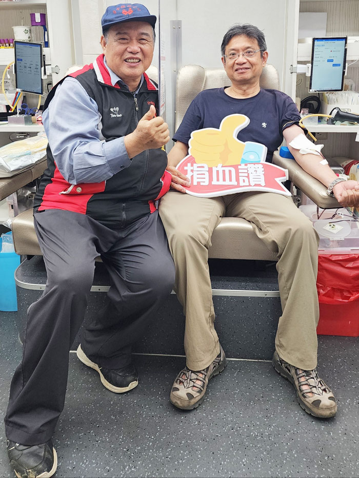 台中捐血中心退休同仁方傑銘先生(右)特別到場捐血支持。