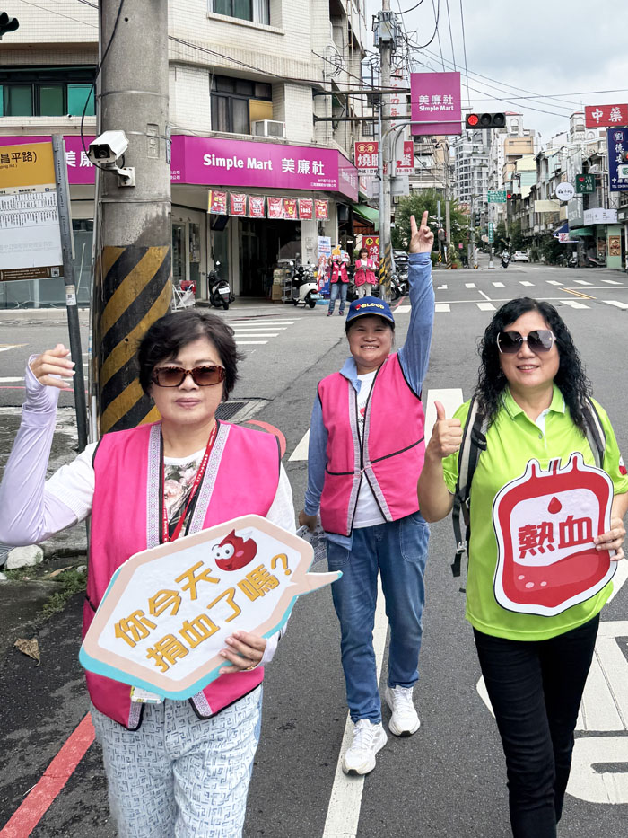 台中捐血中心志工隊隊員手持捐血標語,遊街邀約民眾參與捐血。