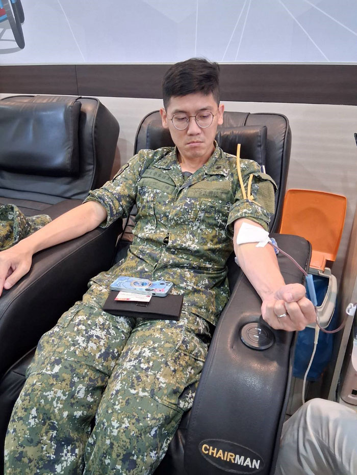 衛生營參謀主任鄭世緯以身作則帶頭捐血。