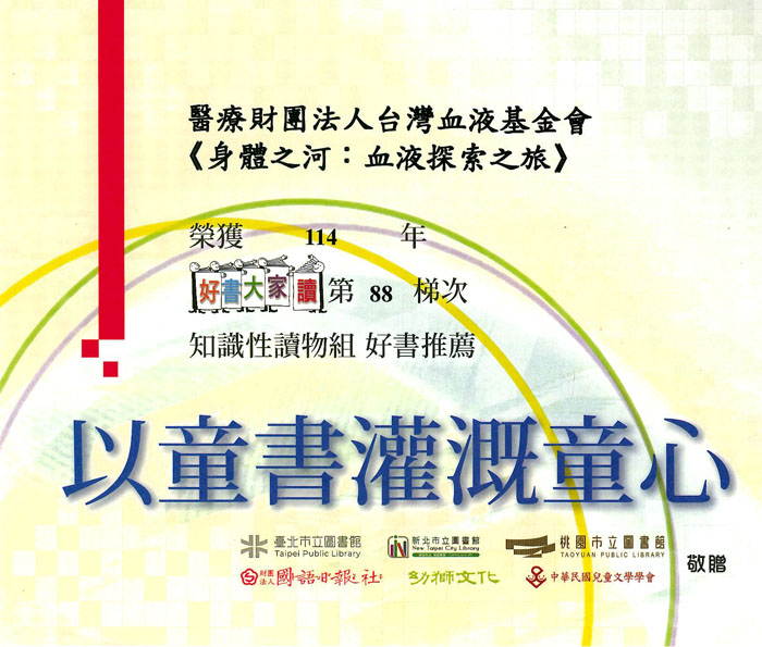 台灣血液基金會於114年出版之《身體之河:血液探索之旅》獲得「好書大家讀」第88梯次推薦。「好書大家讀」每半年推出一次推薦書單,由臺北市立圖書館、新北市立圖書館、桃園市立圖書館聯合主辦、國語日報社、幼獅文化、中華民國兒童文學學會協辦的推廣好書活動。
