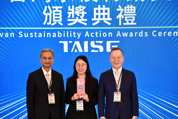 114年9月11日「2025第五屆TSAA台灣永續行動獎」頒獎典禮,由台灣血液基金會執行長王宗曦(中)代表領獎,由環境部次長葉俊宏頒獎(左),右為台灣永續能源研究基金會董事長簡又新。