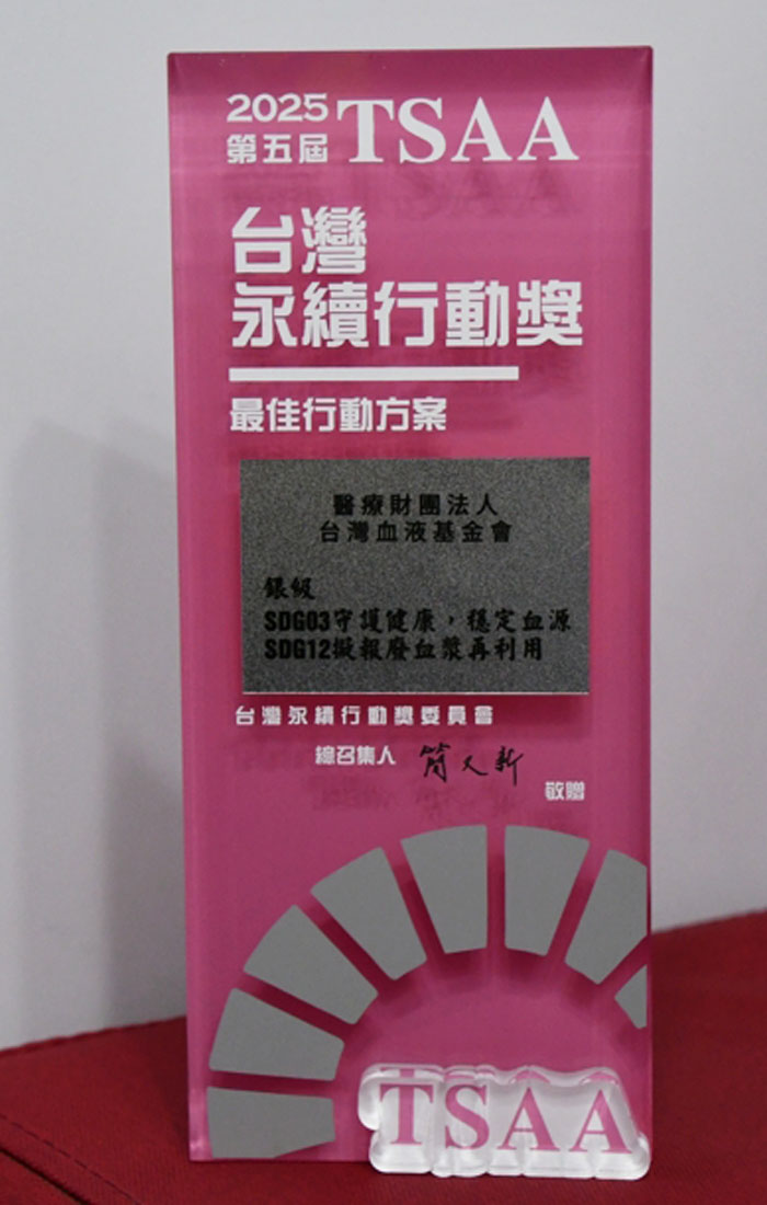台灣血液基金會以「SDG03 守護健康,穩定血源」以及「SDG12 擬報廢血漿再利用」主題,雙雙獲得「2025第五屆TSAA台灣永續行動獎」,並於114年9月11日假世貿一、2025第四屆亞太永續博覽會開幕式中辦理頒獎典禮,本會由執行長王宗曦代表領獎。