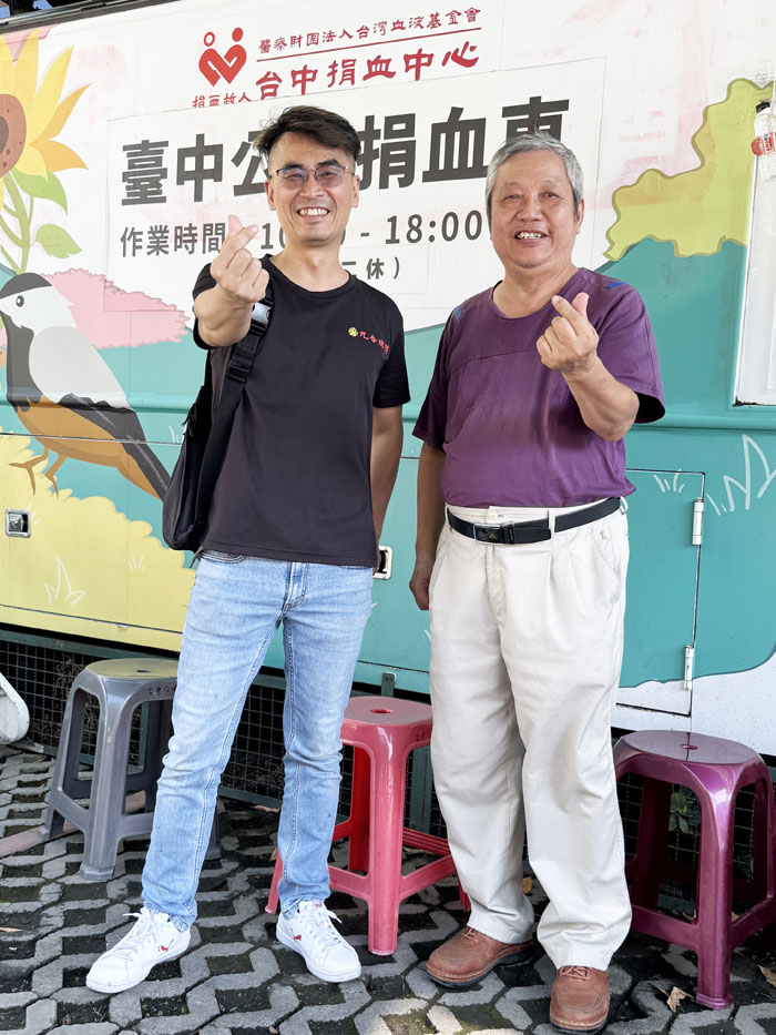 九合脆皮烤鴨太平店老闆蔡孟宗(左)與慧昌電子董事長張耀宗(右)鼓勵民眾踴躍來捐血。