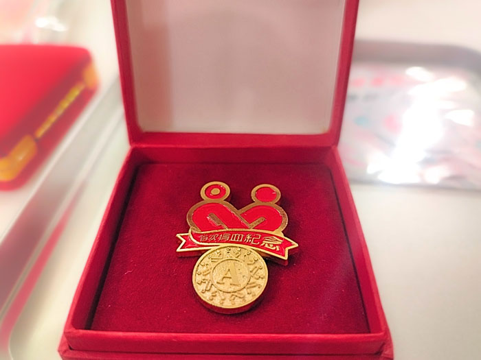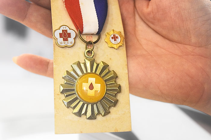A型血的蔡俊賢,首次捐血獲得的紀念章就刻著字母A,是生命非凡的禮物。