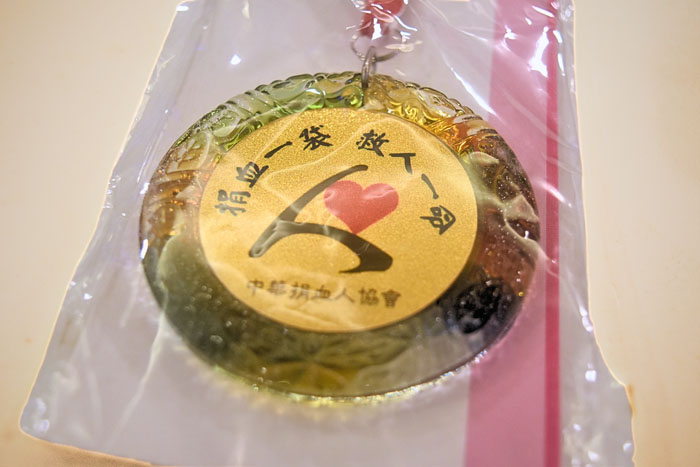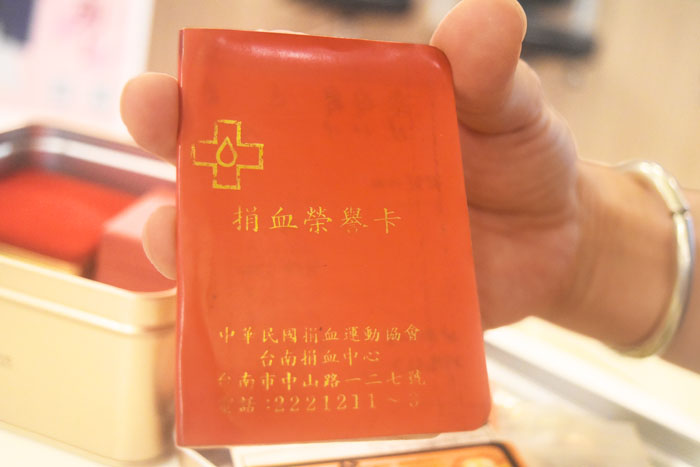 蔡俊賢捐全血得到的紀念章,是他珍藏的至寶。