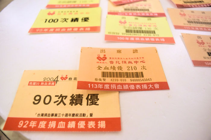 「這是我10次、20次、30次捐血得到的紀念章。」在板橋捐血站的訪談裡,蔡俊賢打開一個金色鐵盒,裡面整齊收藏著一枚枚紀念章,足見他對捐血的重視與珍惜。除了紀念章,從第90次到第210次,每一次表揚大會寄來的「出席證」也被他視為珍寶;但他從未登記上台領獎或拍照,只因為他明白,自己捐血的動機「並不是為了得到殊榮」,而是一種樸實的信念與習慣。