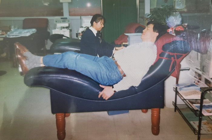王青森目前手邊最早的捐血照,是民國86年在三民捐血室拍的,無論是裝潢或硬體設備,都和如今大不相同。