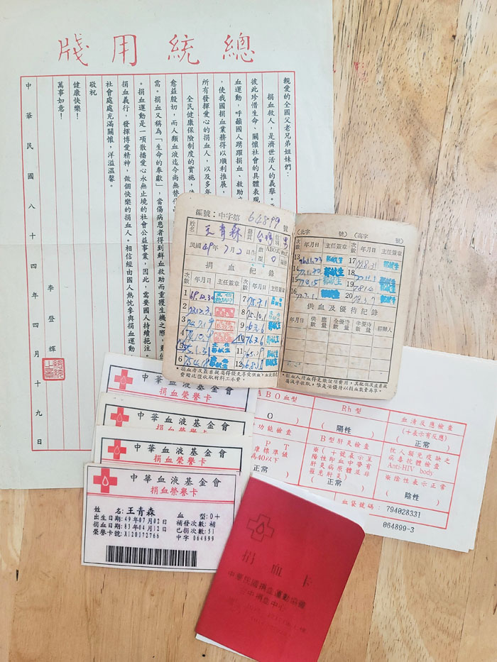 從開始捐血以來,所有紙本捐血卡、捐血榮譽卡、體檢報告,甚至是當年總統寄到家裡勉勵捐血人的信函,王青森都仍好好地收著。