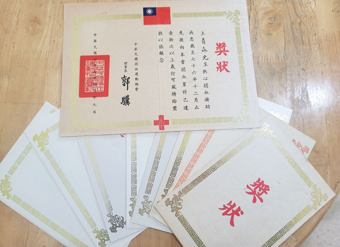 從捐血10次開始拿到的第一張獎狀,一直到最新的獎狀,王青森都按照年份收好。獎狀上沒有任何泛黃或污損,由此可見他對這些物品的寶貝程度。