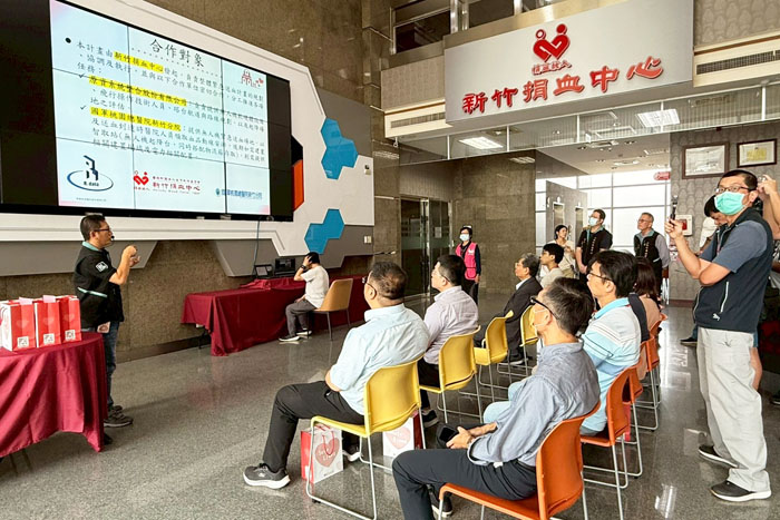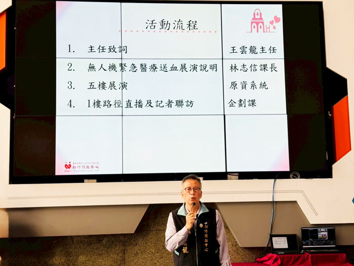 新竹捐血中心主任王雲龍致詞時表示,在戰爭或自然災害等緊急情況下,血液供應的及時性和可靠性,對於挽救生命至關重要。然而,目前主要依賴車輛運輸的血液配送方式,極有可能因路面交通和地理環境等因素而受到限制。
