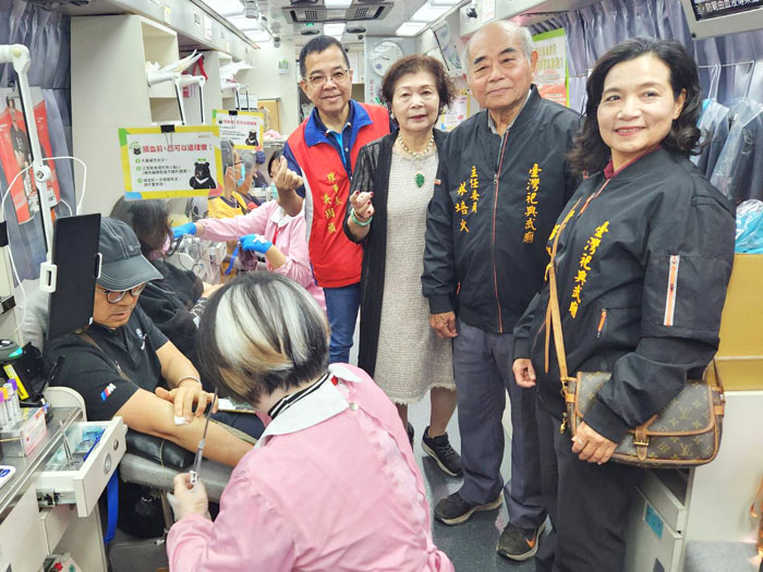 宜得家國際董事長吳國禎(左1)與台灣祀典武廟管理委員會主委林培火(右2)於捐血車上合影。