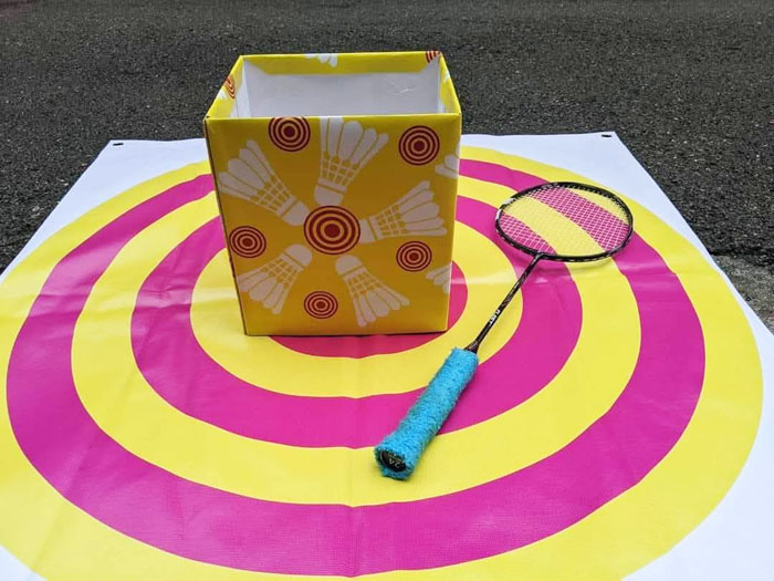 回社慈善會現場互動遊戲—一球進洞,用羽球拍將球拍進箱內,就可得小禮物。