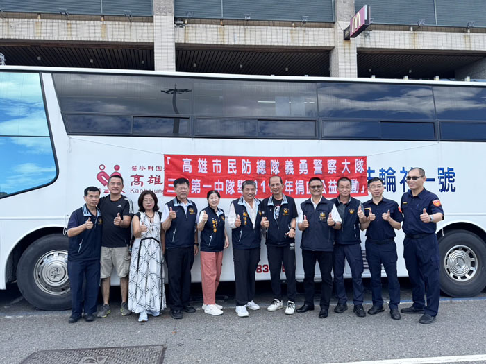 警廣高雄分臺與高雄市義警三民第一中隊在捐血車前合影。