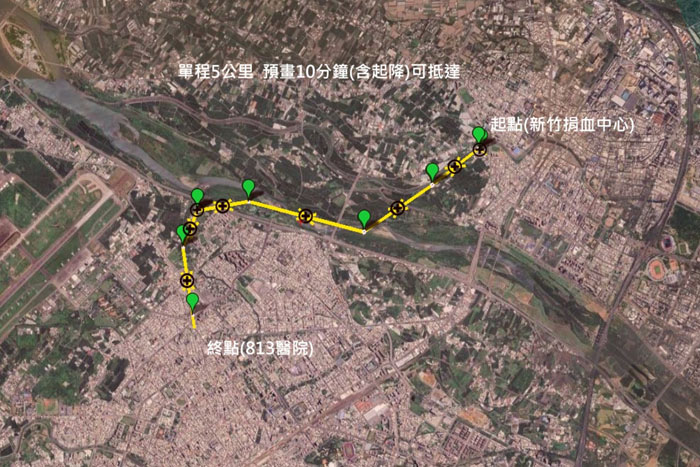 為避開人口稠密區,無人機從新竹捐血中心沿著頭前溪前進,飛往國軍桃園總醫院新竹分院。