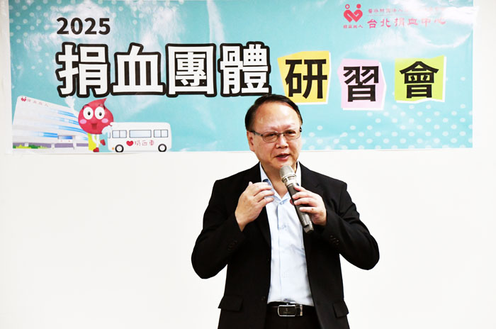 台北捐血中心林敏昌主任為研習課程開訓勉勵,感謝所有主辦單位長年對捐血活動的支持,每一位是穩固醫療韌性的大功臣。