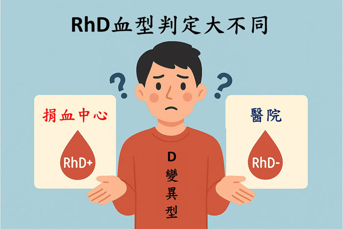 捐血中心為確保血液供應安全,將D變異型判定為RhD陽性;而醫院則為降低病人免疫風險,傾向判定為RhD陰性。